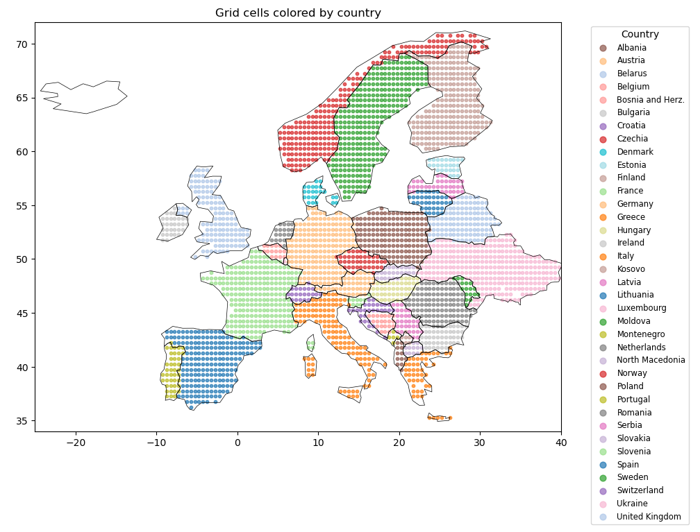 column. Then, add a column called “country” to each row and assign it the name of the country that the grid cell lies in using the shapefilene_110m_admin_0_countries.shp